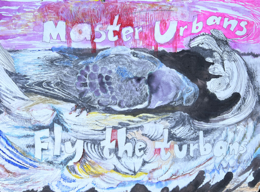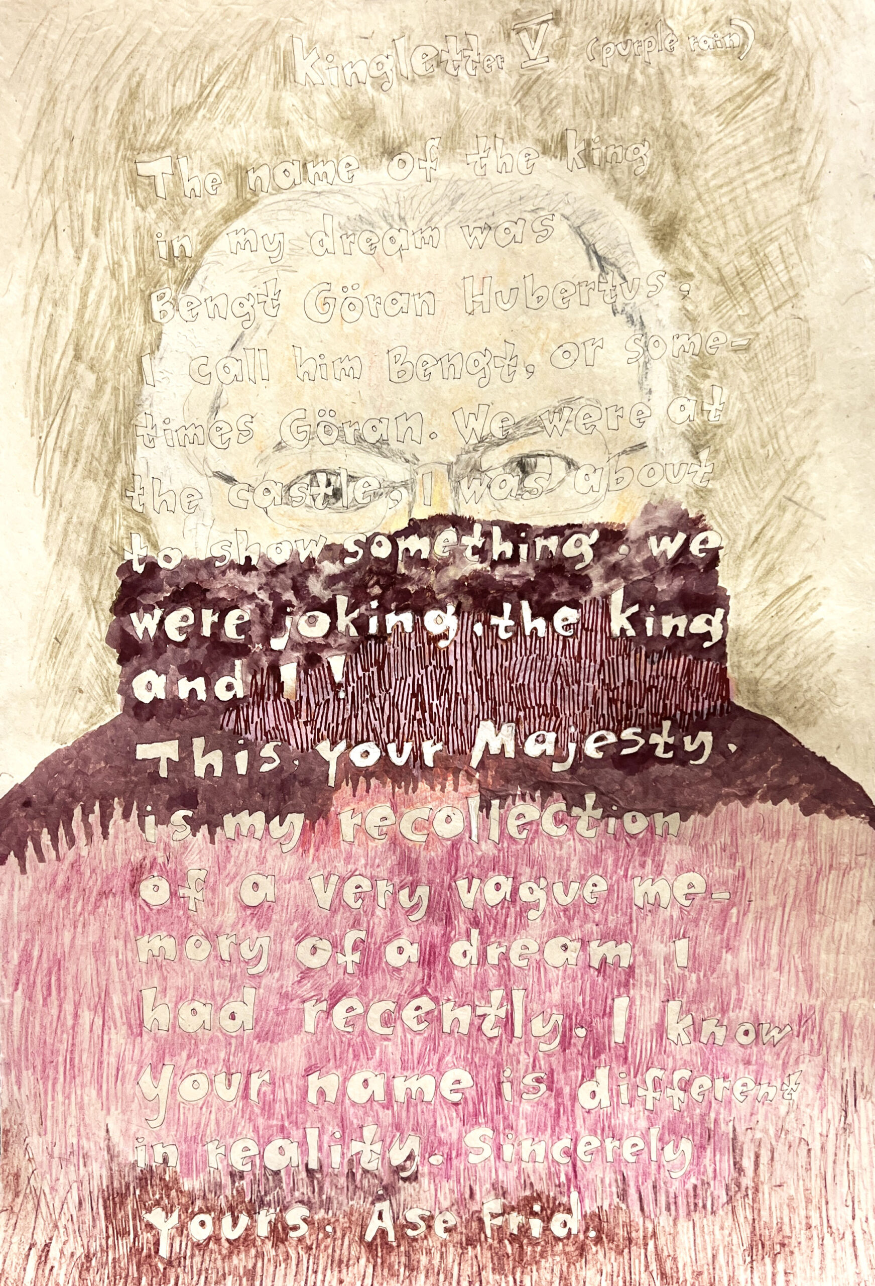 In a technique of her own, the text is first written with ink markers, leaving the white of the paper visible inside the hollow letters—the warp of the painting—to which Åse Frid relates both painterly and temporally. In this way, an image is slowly woven forth with the help of the brush around the text. She has worked with this way of painting and writing since 1997, when, while living in Los Angeles, she created illustrated travel letters to the King and to Iggy Pop—works based on dreams, difficult to interpret, in which they appeared.